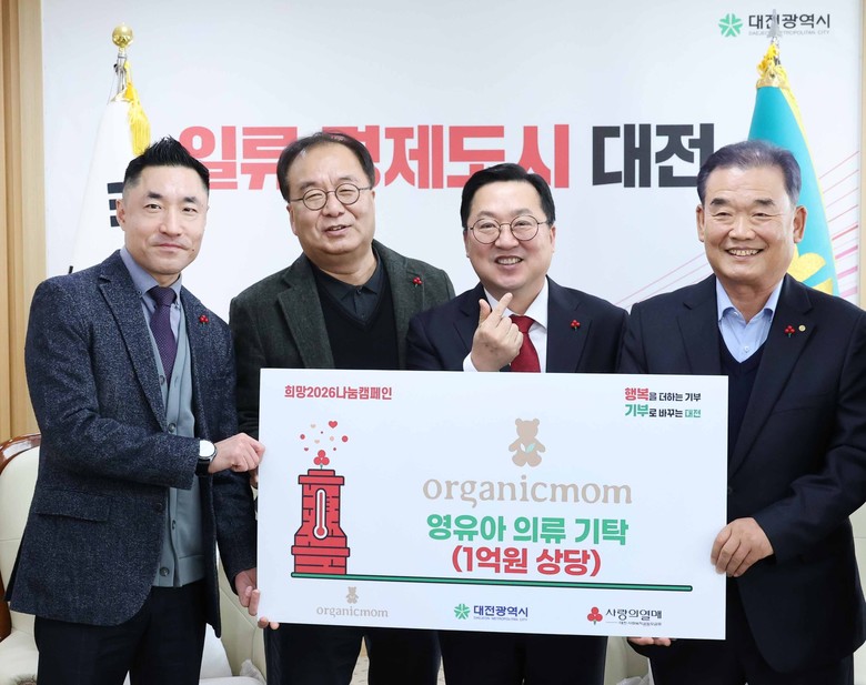 [세계타임즈=대전 이채봉 기자] 대전시는 30일 ㈜중동텍스타일(오가닉맘)로부터 대전사회복지공동모금회를 통해 영·유아용품 1억 원 상당을 전달받았다.