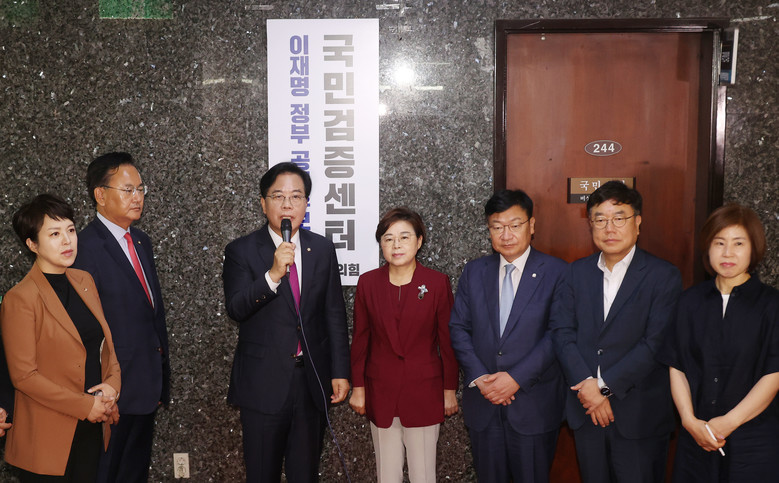 [세계타임즈 = 신상철 기자] 국민의힘 송언석 비상대책위원장 겸 원내대표가 8일 서울 여의도 국회에서 열린 '이재명 정부 공직후보자 국민검증센터' 현판식에서 인사말을 하고 있다. 2025.7.8