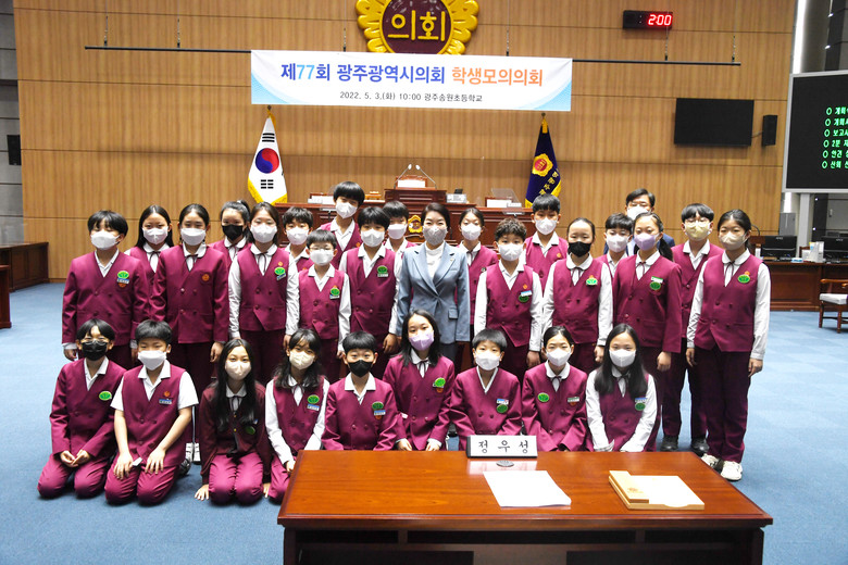이번 학생 모의의회는 남구 광주송원초등학교가 지역구인 임미란 시의원이 참관한 가운데 학생 28명이 참여했다. 회의는 2분 자유발언, 조례안 심의·의결 등 지방의회 의정 활동을 직접 체험하는 기회의 장으로 진행됐다.