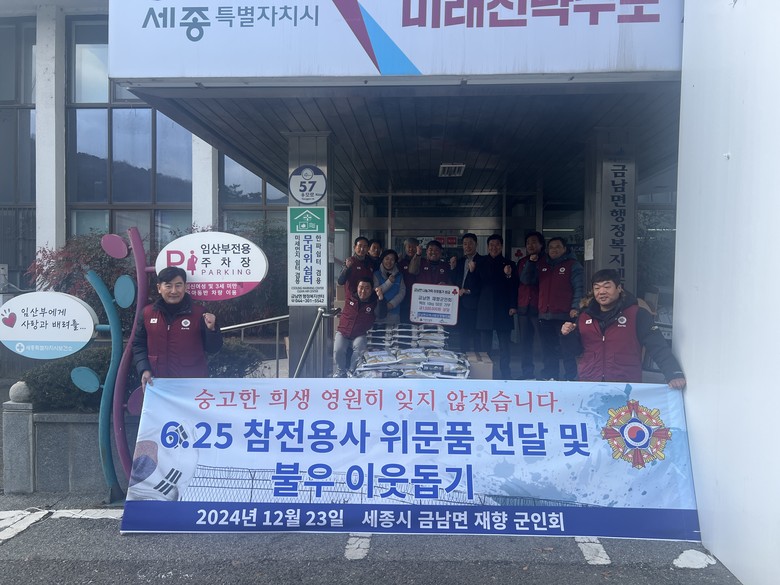 최경식 금남면재향군인회 회장은 “국가 수호와 안전보장을 위해 공헌하신 6.25 참전유공자와 지역의 어려운 이웃들을 위한 나눔을 실천하게 되어 뜻깊다”며 “앞으로도 지역사회에 기여할 수 있는 다양한 활동을 이어가겠다”고 말했다.