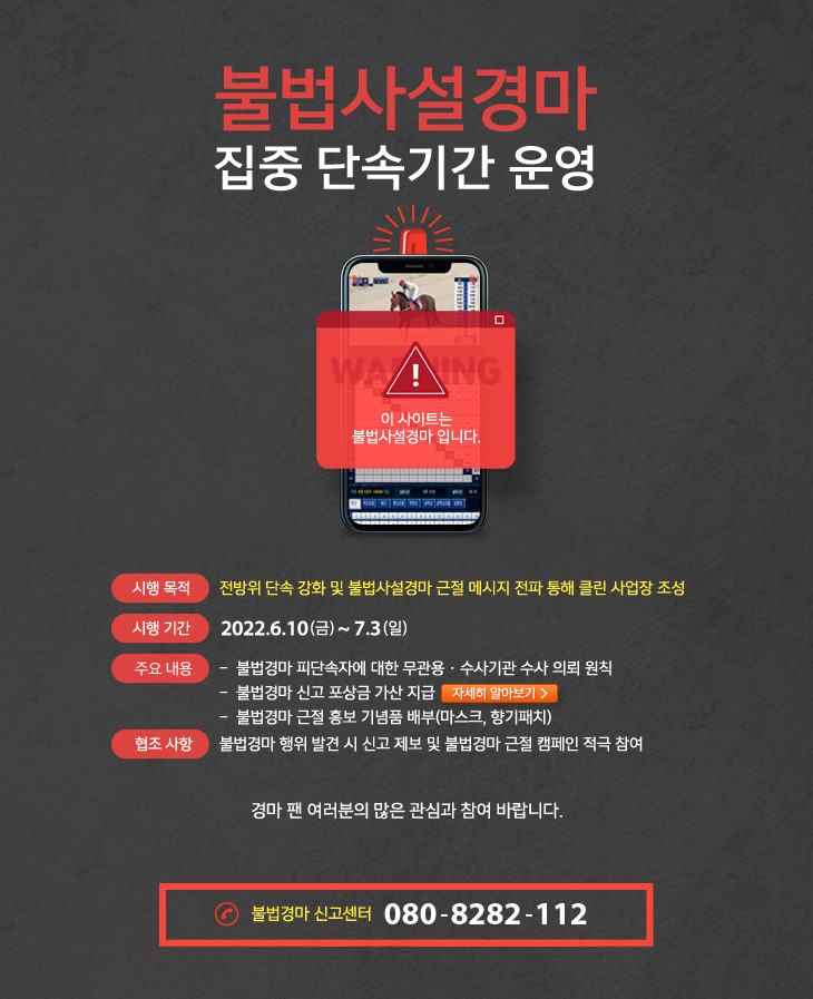 이번에 운영되는 불법경마 집중 단속기간은 불법경마에 대한 감시 강화, 신고포상금 제도 활성화, 유관기관과의 단속 공조 강화 등을 통해 불법경마의 확산을 원천 차단하기 위한 취지에서 기획됐다.