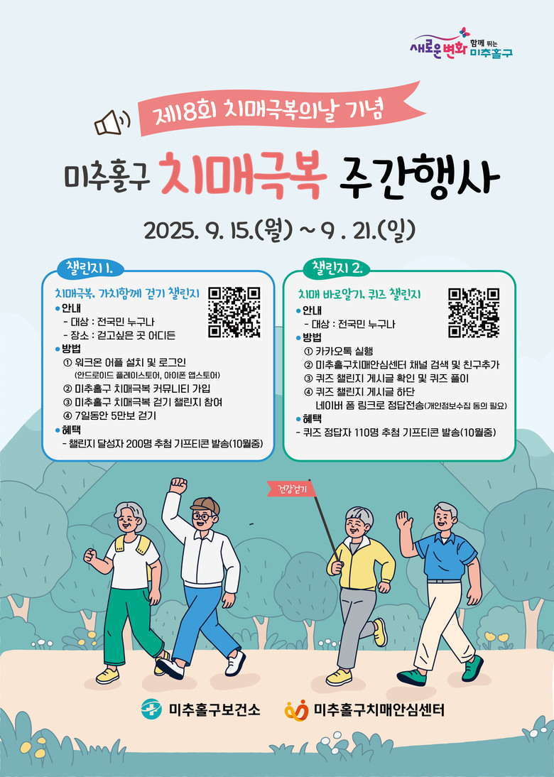 첫 번째는 모바일 걷기 플랫폼 ‘워크온’ 앱을 활용한 ‘2025 미추홀구 치매 극복, 가치 함께 걷기 챌린지’다.