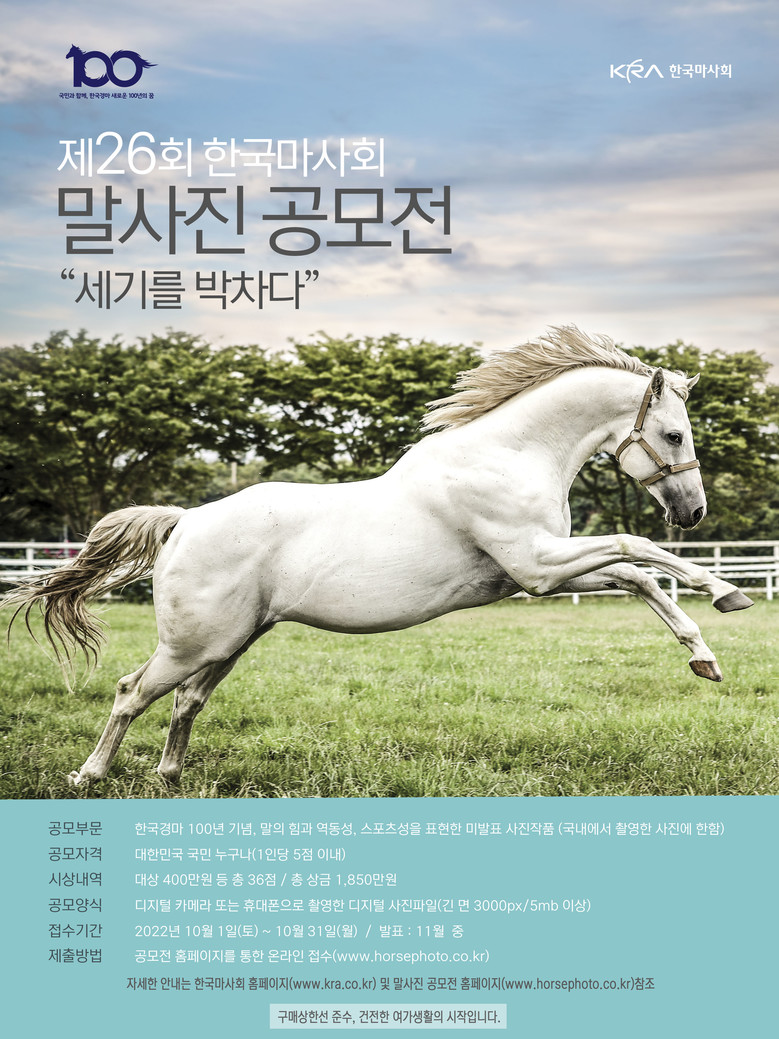 이밖에 제26회 말사진 공모전의 자세한 안내는 한국마사회 홈페이지(www.kra.co.kr) 공지사항 및 말사진공모전 접수홈페이지(www.horsephoto.co.kr)를 통해 확인 가능하다.