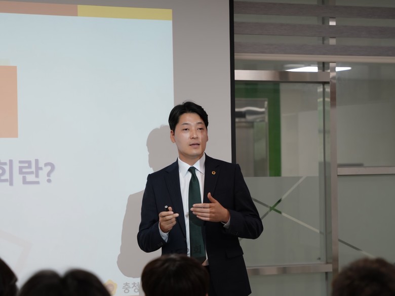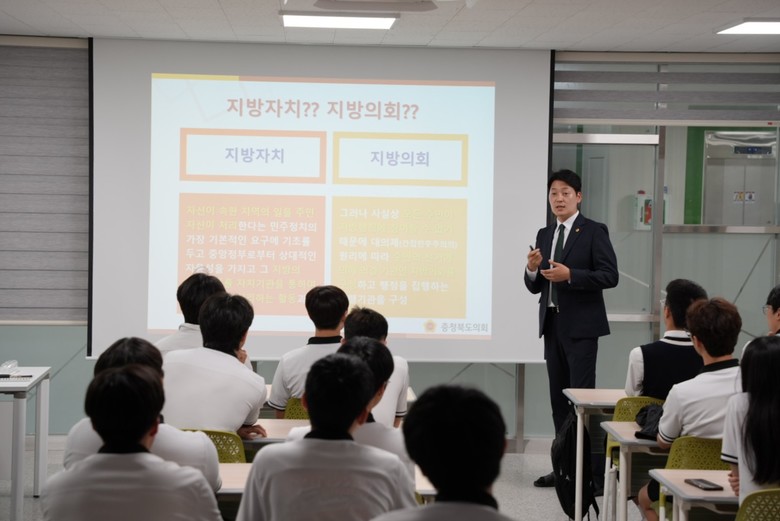 이날 의회교실에는 행정문화위원회 소속 조성태 의원(충주1)이 중앙탑고를 방문해 30여 명의 학생을 대상으로 조례 제정 및 개정, 예산·결산 심의, 행정사무감사 등 도의회의 역할을 설명했다.