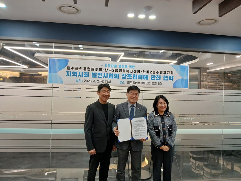 [부평구 세계타임즈=심하린 기자] 부평구 산곡2동은 지난 2일 산곡2동 주민자치회, 미추홀신용협동조합과 ‘지역사회 발전 및 소외계층 지원을 위한 업무협약(MOU)’을 체결했다.