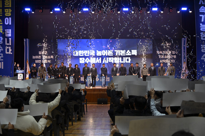 여기에 행사 참석자 전원이 ‘지속가능한 장수 기본소득으로 시작합니다’의 슬로건이 적힌 카드를 들어 올리며 환호로 화답하는 퍼포먼스가 펼쳐지며 전 군민 기본소득 시대 개막을 함께 기념했다.