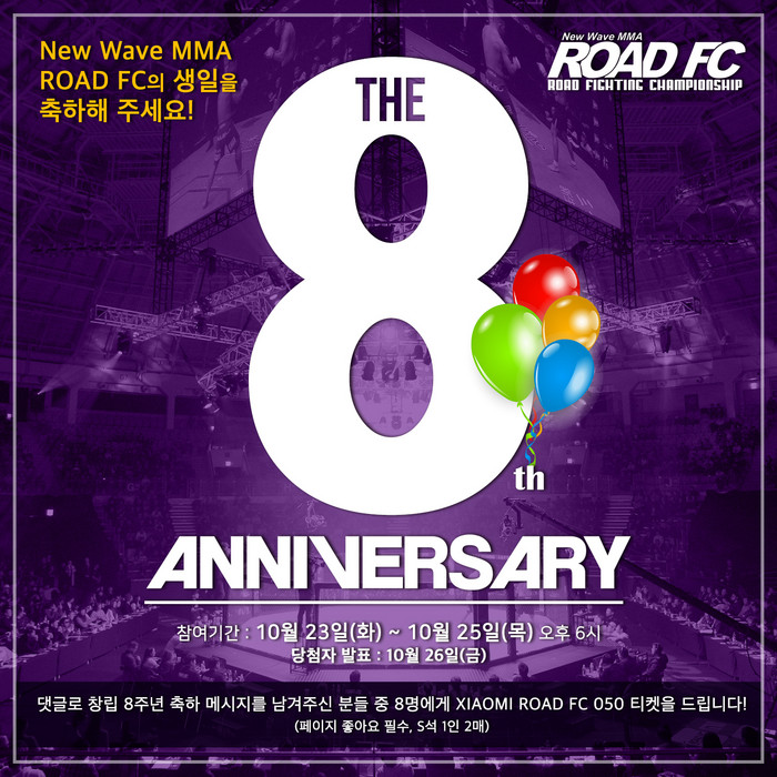 의미 있는 대회 함께 창립 8주년을 기념해 ROAD FC는 팬들에게 XIAOMI ROAD FC 050 티켓을 증정하는 이벤트를 진행한다. 이벤트는 ROAD FC 공식 SNS (https://www.facebook.com/roadfc/)에서 확인할 수 있다.