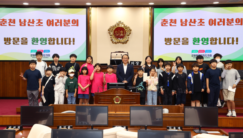 [강원도 세계타임즈=김민석 기자] 강원특별자치도의회(의장 김시성)가 도민과의 소통을 확대하기 위해 도민 대상 견학 프로그램을 운영 중인 가운데, 5월 23일(금) 춘천 남산초등학교 학생과 인솔 교사 등 30여 명이 강원특별자치도의회를 찾았다.