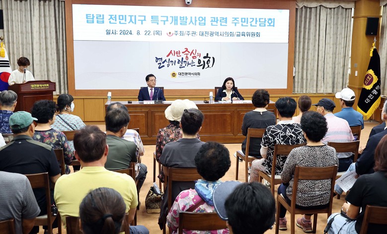 대전시의회가 주최하고 교육위원회가 주관한 이번 간담회는 탑립·전민지구 주민 80여 명이 참석해 특구개발사업에 대해 궁금한 점이나 의견을 자유롭게 제시하는 자리로 마련됐다.