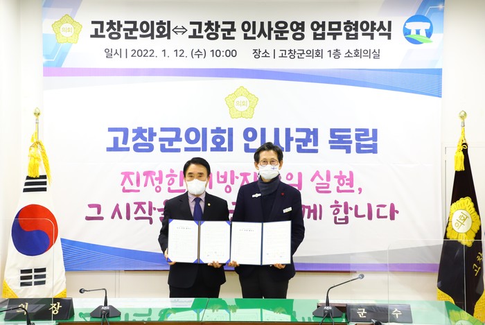 [고창=세계타임즈 김동현 기자] 전북 고창군의회와 고창군은 지난 12일 의회 소회의실에서 지방의회 인사권 독립에 따른 인사 운영 관련 업무 협약을 체결했다.