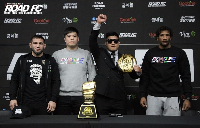 [세계타임즈 김인수기자] ROAD FC (로드FC)가 지난 20일 서울시 청담동 로드짐 강남에서 100만불 토너먼트 결승전 기자회견을 개최했다. ROAD FC 김대환 대표, ‘라이트급 챔피언’ 권아솔(33, 팀 코리아MMA)과 경기 출전을 앞두고 있는 샤밀 자브로프(35, AKHMAT FIGHT CLUB), 만수르 바르나위(27,TEAM MAGNUM/TRISTAR GYM)까지 기자회견에 참여했다.