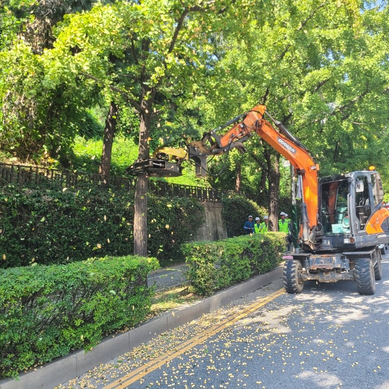 구에 따르면 9월 말에서 10월 말까지 진동 수확 장치와 장대 등을 활용해 가로수 은행 열매 수확 작업을 진행한다.