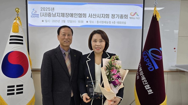 [충남 세계타임즈=이현진 기자] 충남도의회 이연희 의원(서산3·국민의힘)이 12일 (사)충청남도지체장애인협회 서산시지회(회장 강경환)로부터 장애인의 삶의 질 향상과 복지증진에 기여한 공을 인정받아 감사패를 받았다.