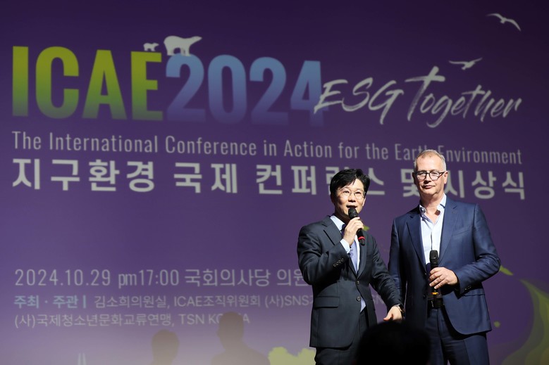 (TSN 코리아, SNS기자연합회 김용두 회장과 TSN 존그리셔 회장이 10월 29일 열린 'ICAE 2024' 행사에서 TSN 코리아 ESG 비전 발표 및 발족식을 진행하고 있는 모습. /사진=ICAE조직위원회 제공)