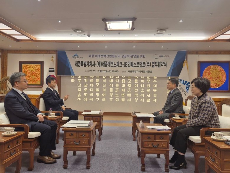 시는 26일 (재)세종테크노파크(원장 양현봉)와 JB인베스트먼트㈜(대표이사 이구욱) 간 ‘세종 미래전략산업펀드의 성공적 운영’을 위한 업무협약을 체결했다고 밝혔다.