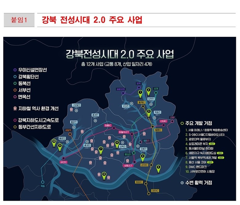 ‘다시, 강북전성시대 2.0’은 재원 16조 원(국고보조금 및 민간투자 6조원+시비 10조 원)을 강북지역에 전략적으로 투자해 강북지역 교통망을 대대적으로 혁신하고 성장의 주축이 될 산업거점을 조성해 도시구조를 근본적으로 재편하는 것이 핵심이다.
