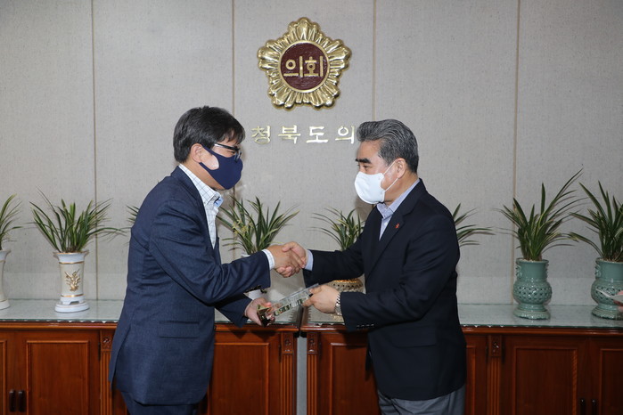 이날 제주도의회 김용범 운영위원장은 충북도의회를 방문해 제주특별자치도지사를 대신해 명예도민증을 전달했다.