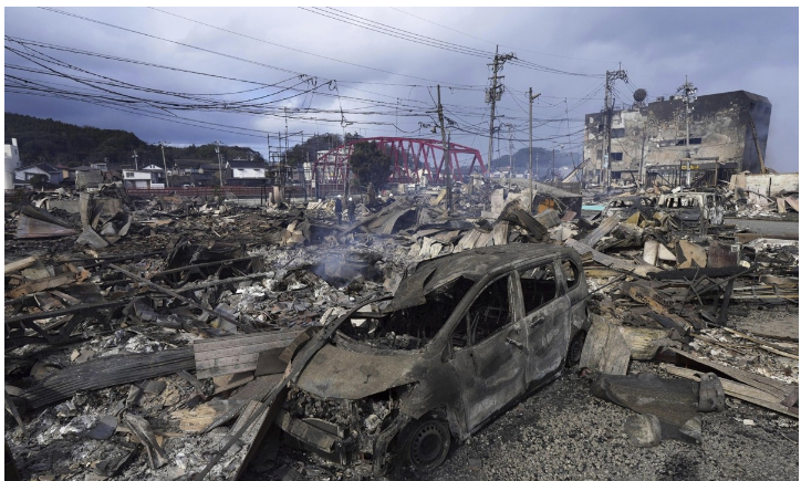 와지마시에서는 전날 강진 직후 발생한 화재로 건물 약 200동이 소실됐다고 교도통신은 전했다.NHK가 헬리콥터에서 촬영한 영상을 보면 오전에도 각지에서 화재로 연기가 솟아 바람을 타고 바다 쪽으로 이동했다.화재로 건물이 사라지고 전봇대와 시설물이 기울어진 와지마 아침 시장은 관광객으로 북적였을 때의 활기를 잃고 폐허로 변했다.노토 반도의 다른 지역과 인근 지역에서도 산사태가 일어나 적지 않은 주택과 건물이 무너져 내렸고, 일부 목조가옥은 기둥이 진동을 버티지 못해 폭삭 주저앉았다.아울러 도로 곳곳에 금이 가면서 자동차가 균열로 생긴 커다란 구멍에 빠지거나 도로 중간 부분이 아예 끊기기도 했다.포구에서 뒤집힌 채 바닷물에 선채가 잠긴 배와 거리에 나뒹구는 거대한 석조 조각물들은 규모 7.6 강진의 위력을 실감하게 했다.하세 히로시 이시카와현 지사는 이날 언론에 노토 반도 스즈(珠洲)시의 한 항구에서 100m에 이르는 지역이 침수돼 많이 주택이 손상을 입었다고 밝혔다.일본 최대 포털사이트인 야후재팬에서 지진 피해 영상을 접한 한 네티즌은 피해가 너무나 심대하다며 어제 지진부터 150회가 넘는 여진이 지속해서 일어났는데, 적어도 이 흔들림만이라도 진정되길 바란다고 밝혔다.다른 네티즌은 이번 지진으로 인한 쓰나미지진해일는 최고 높이가 1.2m였다고 하지만, 방심은 금물이라는 댓글을 달았다.일본인들은 사회관계망서비스(SNS)를 통해 지진 당시 촬영한 사진과 영상을 공유하며 피해 상황을 전했다.한 네티즌은 전날 지진으로 전봇대와 가옥이 쓰러진 영상을 SNS에 올리고 집은 반쯤 파손, 도로는 갈기갈기. 아직 여진이 지속되고 있다. 높은 곳에 있는 피난소에 가고 싶지만, 도로가 끊겼다고 적었다.지진으로 단수 피해가 발생한 지역에서는 주민들이 물을 구하기 위해 긴 줄을 서기도 했다.SNS에서는 2011년 3월 동일본대지진 영상 등 이번 지진과 관계없는 거짓 정보가 확산하고 있다고 NHK는 전했다.
