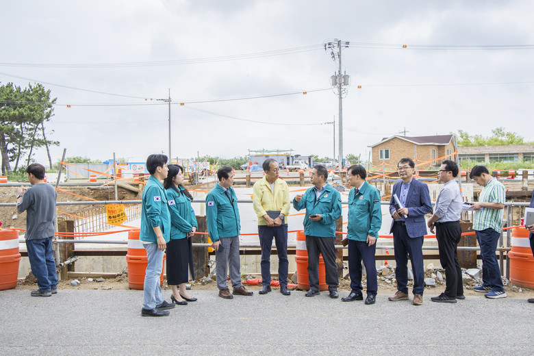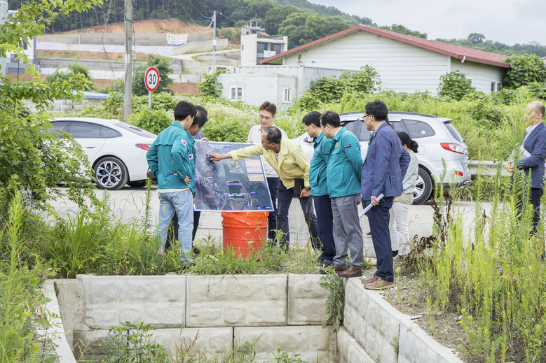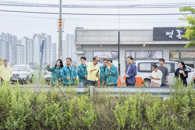 이어 영종 전소천, 동강천, 서당골 및 논골 일대를 시찰하며 배수로 정비 실태 및 배수 시설을 확인하고 ‘중산동 1125-13번지 일원 배수로 정비공사’ 사업 진행 현황을 점검하였으며, 농지 성토에 따른 인근 주민의 피해 상황을 파악하고 대책 마련에 힘써줄 것을 요청했다.