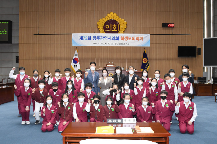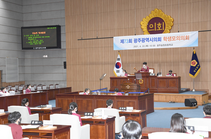 [광주=세계타임즈 손권일 기자] 광주광역시의회(의장 김용집)는 4월 22일(목) 10시에 시의회 본회의장에서 광주송원초등학교 학생들을 대상으로 ‘광주광역시의회 제73회 학생 모의의회’를 개최했다.