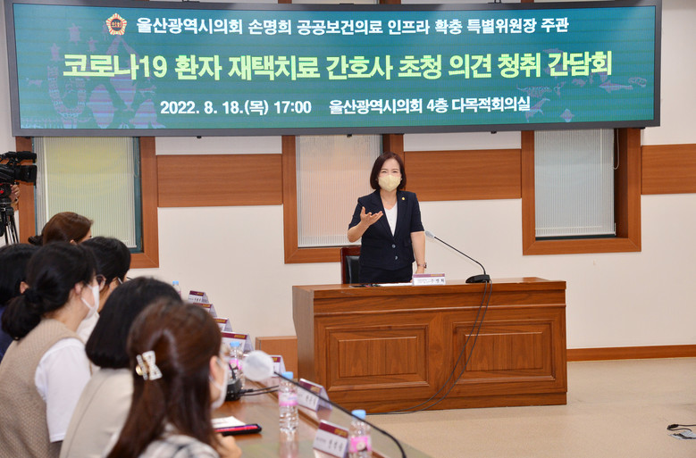 [울산 세계타임즈=이호근 기자] 울산광역시의회 손명희 공공보건의료 인프라 확충 특별위원장은 18일 오후 5시 시의회 4층 다목적회의실에서 ‘코로나19 환자 재택치료 간호사 초청 의견 청취 간담회’를 개최했다.