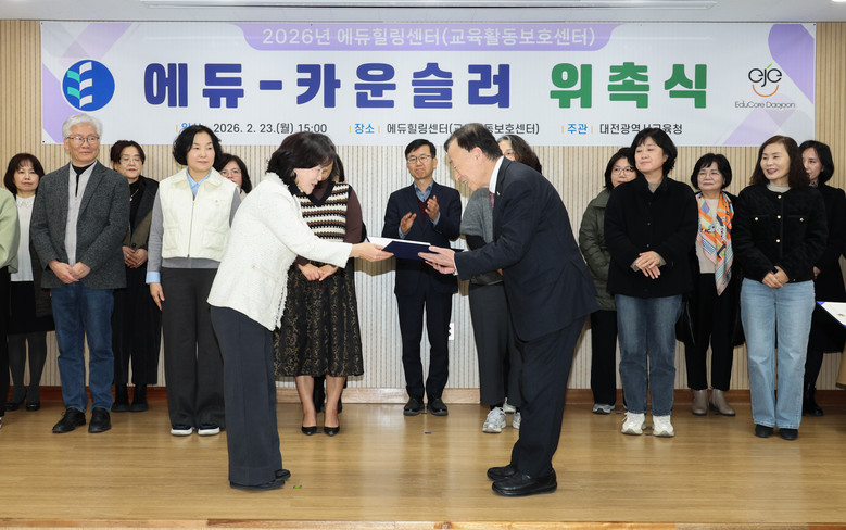 [대전 세계타임즈=이채봉 기자] 대전시교육청은 2월 23일, 에듀힐링센터(교육활동보호센터)에서 ‘2026년 에듀-카운슬러 위촉식’을 개최했다고 밝혔다. 이번 위촉식은 에듀힐링센터가 교육활동보호센터로서의 기능을 강화함에 따라, 교육현장의 예방·치유·성장을 통합 지원할 외부 상담전문가 인력풀인 에듀-카운슬러들에게 위촉장을 수여하는 자리로 마련되었다.