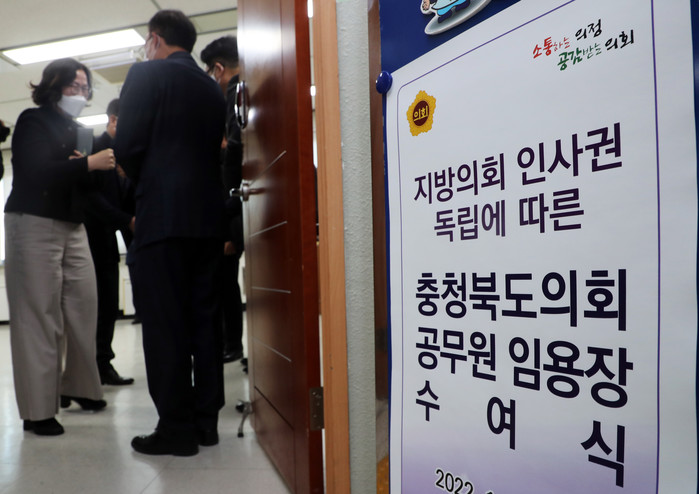[충북=세계타임즈 이현진 기자] 개정 지방자치법 시행 첫날인 13일 충북도의회가 지방의회 인사권 독립에 따른 공무원 임용장 수여식을 진행하고 있다./충북도의회 제공