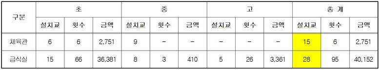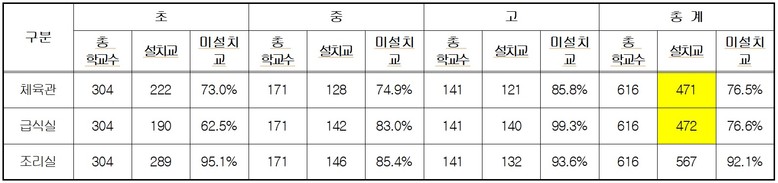 또한, 부산광역시교육청 자료에 의하면 부산 각급 체육관의 3.2%, 급식실은 5.9%만 공기정화시설이 설치되어 있으며, 이 중 체육관의 경우 3년 동안 필터 교체는 고작 6회만 실시된 것으로 확인되었다.