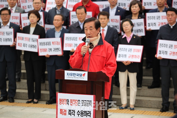 존경하는 국민여러분. 자유한국당은 많은 것 원하지 않는다. 정의롭고 공정한 대한민국을 외친 문재인 대통령이 지난 대선공간에서 드루킹 댓글조작과 아무런 상관이 없다는 것, 특검 수사결과가 밝혀지면 얼마나 더 정정당당한 대통령되겠는가. 남북정상회담 정성 들여서 잘하시면서, 왜 드루킹 특검은 이렇게 수용하지 않고 있는가. 이렇게 꼼수를 쓰고 있는지. 왜 그렇게 중요한 추경 왜 5월 하순에 처리하자는 것인가. 빨리 처리해야 된다.