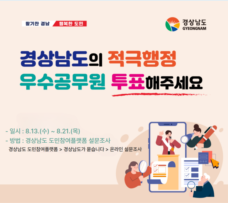 - 우수사례는 카드뉴스·웹툰 등으로 제작해 도민과 공유 [세계타임즈=경남 최성룡 기자] 경상남도(도지사 박완수)는 2025년 상반기 적극행정 우수공무원 선발을 위해 8월 13일부터 21일까지 온라인 도민투표를 실시한다.