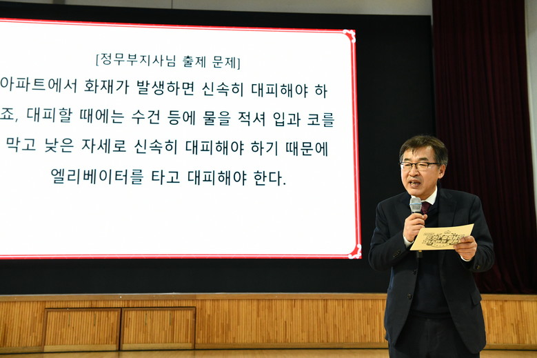 전형식 정무부지사는 인사말을 통해 “어릴 때부터 재난과 안전에 대한 올바른 인식을 갖는 것이 무엇보다 중요하다”며 “이번 재난안전 골든벨을 통해 학생들이 스스로의 생명을 지키고 우리 지역의 안전한 미래를 책임지는 멋진 주인공이 되어 주길 기대한다”고 말했다.