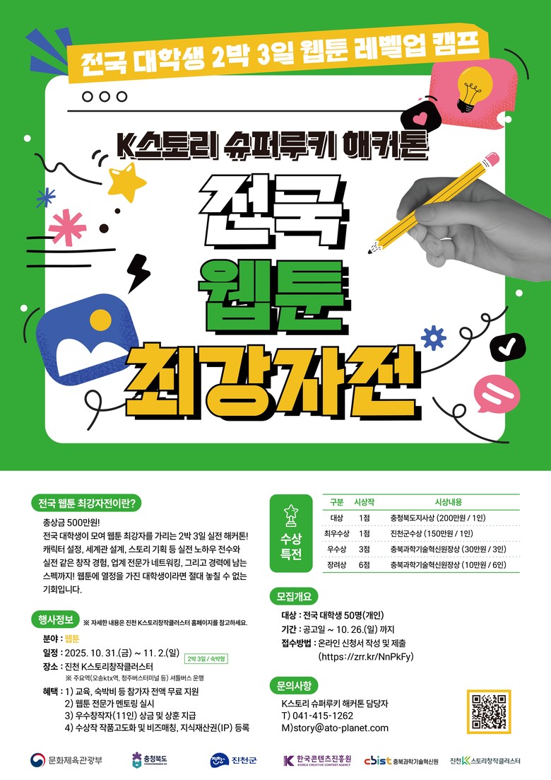 대한민국 K-웹툰이 전 세계의 주목을 받는 가운데 새로운 창작 인재를 발굴하고 육성하기 위해 마련된 이번 행사는, 10월 31일부터 11월 2일까지 2박 3일간 진천 K스토리창작클러스터에서 해커톤 형식으로 진행된다. 우수 참가자 11명에게는 총상금 500만 원과 향후 콘텐츠 제작 지원 기회가 주어질 예정이다.
