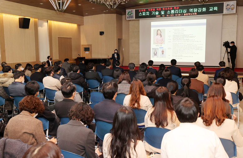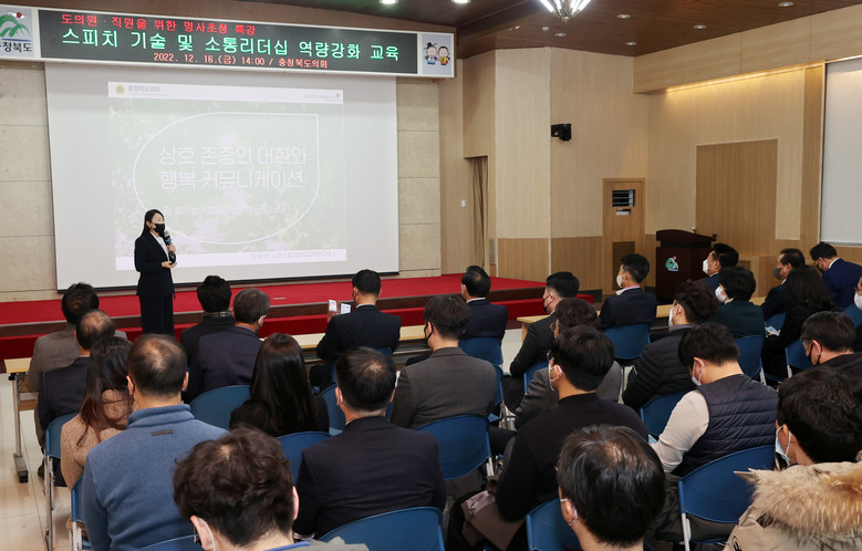 [충북 세계타임즈=이현진 기자] 충북도의회는 16일 도청 대회의실에서 도의원 20여명과 도의회‧도청 직원 100여명을 대상으로 스피치 기술과 소통리더십에 대한 특강을 실시했다.