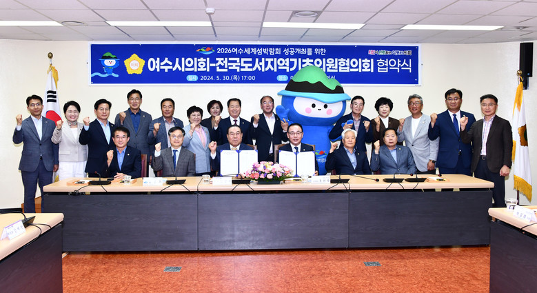 [여수시 세계타임즈=우덕현 기자] 여수시의회(의장 김영규)는 5월 30일 소회의실에서 전국도서지역기초의원협의회(협의회장 조인호)와 2026여수세계섬박람회 성공개최를 위한 협약식을 열었다.