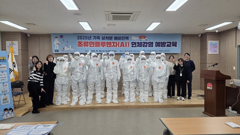 [중구 세계타임즈=심하린 기자] 인천 중구보건소(국제도시보건과)는 지난 26일 중구 제2청 대회의실에서 가축 살처분 예비 인력과 보건소 신속 대응요원을 대상으로 ‘조류인플루엔자(AI, Avian Influenza) 인체감염 예방 교육’을 실시했다.