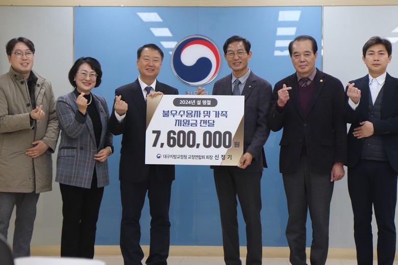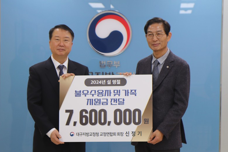 [세계타임즈]최성룡기자 = 대구지방교정청 교정연합회(회장 신정기)’는 김종식 사무총장, 박종민 사무차장, 노재성 재무와 함께 설 명절을 맞이하여 지난 31.(수) 11:00 법무부 대구지방교정청을 방문하여, 김동현 대구지방교정청장에게 대구지방교정청 산하 19개 교정시설의 불우수용자 및 가족에게 총 7,600,000원을 지원하였다.