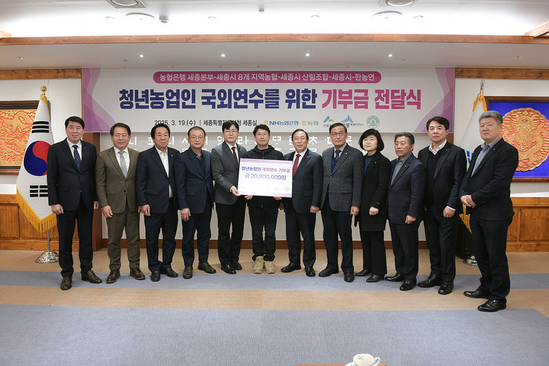 세종특별자치시(시장 최민호)는 19일 시청 5층 세종실에서 청년농업인 국외연수 지원을 위한 기부금 전달식을 개최했다.