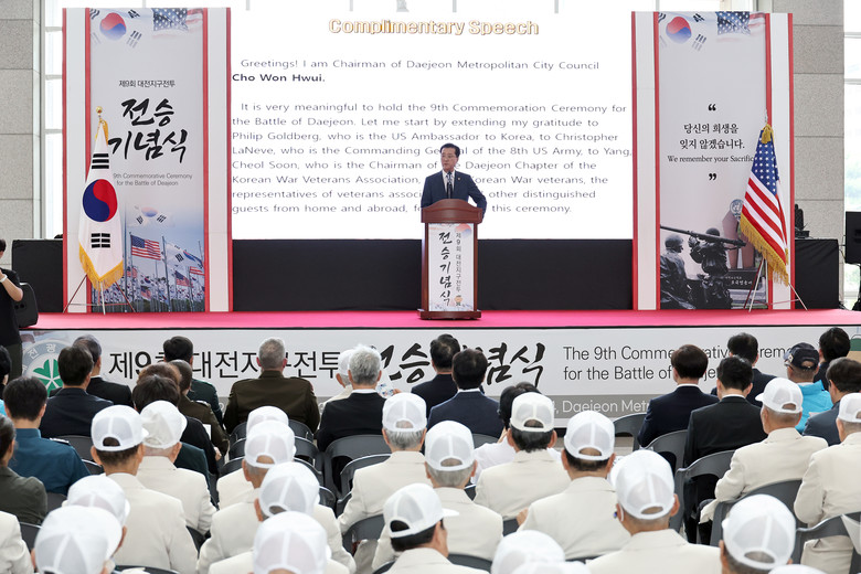 조원휘 의장은 축사를 통해 “머나먼 이국땅에서 대한민국의 자유 수호를 위해 장렬히 싸우다 생을 마감하신 미군 장병들께 깊은 경의를 표한다”며, “대전시의회는 앞으로도 참전 용사분들의 숭고한 희생과 헌신을 잊지 않고 보훈에 소임을 다할 수 있도록 더욱 노력하겠다”고 말했다.