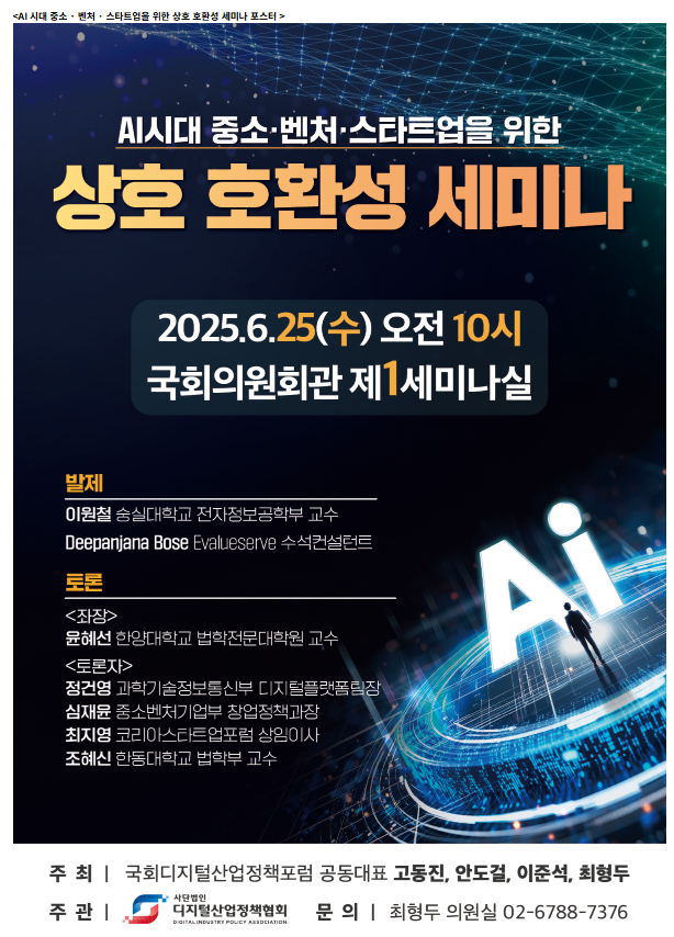 오전 10 시부터 진행되는 세미나에서는 AI 시대 중소 · 벤처 · 스타트업을 위한 상호 호환성를 주제로 이원철 숭실대학교 전자정보공학부 교수 와 디판자나 보스 (Deepanjana Bose) 이밸류서브 (Evalueserve)* 수석컨설턴트가 발 제를 한다 .