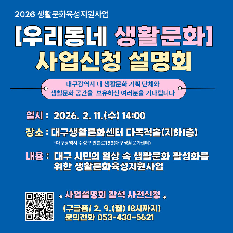 2026 생활문화육성지원사업 「우리동네 생활문화」 공모에 대한 자세한 내용은 대구문화예술진흥원(www.dgfca.or.kr) 또는 대구생활문화센터(www.dccc.or.kr) 누리집에서 확인할 수 있다.