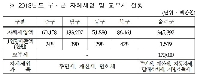 2018년도 당초예산 기준으로 구.군 자체세입액을 보면, 중구 602억원, 남구 1,332억원, 동구 519억원, 북구 861억원 등 자치구 평균이 828억원인데 반해 울주군은 약4배가 넘는 3,454억원 정도이며, 1인당 세출액도 상당히 많은 것을 알 수 있습니다.