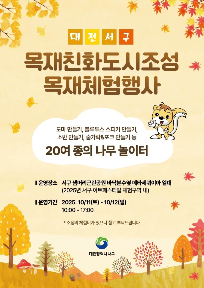 서철모 청장은 “서구가 목재 친화 도시로 발전하기 위해 구 대표 축제와 연계해 체험 행사를 마련했다”며 “많은 주민이 참여해 목재 이용에 대한 이해를 높이고, 탄소중립 소재인 목재와 친숙해지는 경험을 누리시길 바란다”고 말했다.