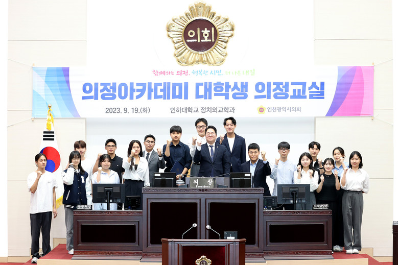 인하대학교 학생 17명은 19일 인천시의회에서 열린 ‘의정 아카데미’에 참여해 모의국회 의정 체험, 5분 자유발언, 의회의 역할과 기능 등 다양한 체험 프로그램을 진행했다.