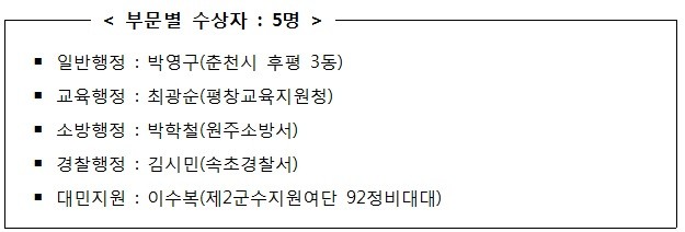 개원 기념식에 이어서, 오전 11시부터 춘천 스카이컨벤션웨딩홀에서「제21회 강원목민봉사대상 시상식」을 개최하여 수상자, 전·현직 도의원, 역대 수상자, 기관 단체장 등 150여명이 참석한 가운데 어려운 여건 속에서도 지역사회 발전과 주민복리를 위해 헌신적으로 봉사한 공직자를 포상.격려할 계획이다.