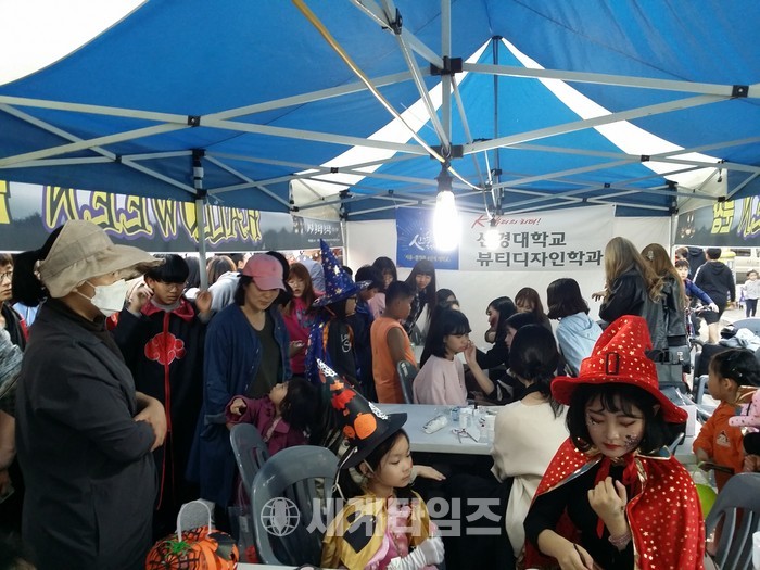 [화성시=세계타임즈 이영진 기자] 지역사회 공헌대학, 학생 중심대학인 신경대학교의 뷰티디자인학과는 10월 28일 17시부터 시작 된 남양 할로윈 축제에서 지역 청소년들을 위한 할로윈분장 자원봉사에 참여하여 행사에 어울리는 특색의 할로윈 분장을 쉴 새 없이 그려내어 최고의 인기를 누렸다.