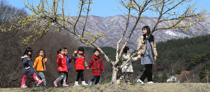 화창한 봄날씨를 보인 22일 경남 함양군 상림공원에서 활짝 핀 노란 산수유와 하얀 눈 옷으로 갈아입은 대봉산 사이로 봄맞이 나들이를 즐기고 있다.