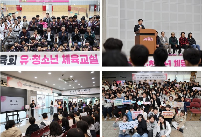 | ▲ (시계방향으로) ① 3월 28일 마포구민체육센터에서 열린 유·청소년 체육교실 통합 결단식에서 박강수 마포구청장이 참가 청소년 및 학부모들과 함께 기념촬영을 하고 있다. |