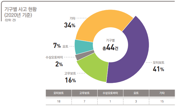 한편, 통계자료에 의하면 수상레저기구중 모터보트 사고가 41%로 가장 많고, 운항부주의로 인한 사고가 59%에 달하는 것으로 나타났다.