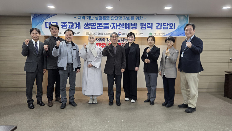▸ 자살예방 상담전화 109 등 시민 도움 서비스 안내 강화 [세계타임즈=대구 한윤석 기자] 대구광역시는 지난 3월 31일 범정부 생명지킴추진본부와 함께 지역 종교계와 생명존중・자살예방 협력 간담회를 개최하고 시민 대상 현장 홍보활동을 실시했다.