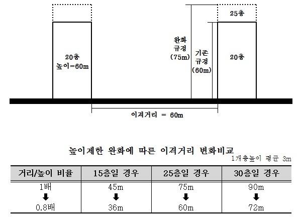 현행 조례에는 상위법에 따라 일조 및 채광, 시계(視界), 프라이버시, 화재에 대한 안전성 등 주민의 주거환경 보호를 위해 주거지역의 공동주택에서 2개동 이상의 건축물이 마주보게 될 경우 건축물 높이만큼 각 동간 전면거리를 이격하도록 규정하여, 건축물간 이격거리를 활용한 높이제한제도로 운영되고 있다.
